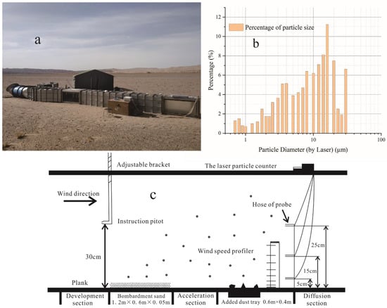 The experiments were conducted on a five-plywood board under sand supply. Three dust aerosol probe hoses with heights of 5, 15, and 25 cm were connected to an American Handheld 3016 laser particle counter, which was installed at the end of the working section and was used to measure the PM10 concentrations. The particle monitoring size range of the counter was 0.3–25 µm, and it was an inhaler type with a flow rate of 2.83 L·min−1. The measurement time interval was set at 10 s. A wind speed profiler composed of nine pitot tubes of different heights (0.5, 0.9, 1.5, 2.2, 4.3, 8.3, 12.3, 16.3, and 20.2 cm) was used to measure the wind profile, and each pitot tube was calibrated using a standard one before use. A pitot tube was installed in front of the experiment bed and at 30 cm above the bed to measure the centerline inlet wind speed. The dune sand for sand supply was cleaned with water and dried before use as a source of bombarding sand to minimize the external dust influence. The sand bed was 1.2 m long and 0.05 m thick. The tested Gobi was placed in a tray with dimensions 0.6 × 0.4 × 0.04 m, which was placed at the end of the working section. The original Gobi dust content of 27.3% was obtained by sieving the original Gobi soil through a 155-mesh sieve (for particle size <100 µm). The other Gobi quadrats with different dust contents were obtained by adding the powder of clay-crusted soils with mass proportions of 5, 10, 15, and 20% to the original Gobi sample, with the corresponding dust contents as 32.3, 37.3, 42.3, and 47.3%, respectively. The added dust soil was less than 40 µm, with a median particle size of 9.12 µm, and particles smaller than 10 µm accounted for approximately 52.5% (Figure 3b). The gravel coverage and hardness for all of the tested Gobi surfaces with different dust contents were consistent with the original sandy Gobi atop the Mogao Grottoes. Experimental wind velocities were 8, 10, 12, and 15 m·s−1. The length of each experiment was 3 min. The experimental layout is presented in Figure 3c.