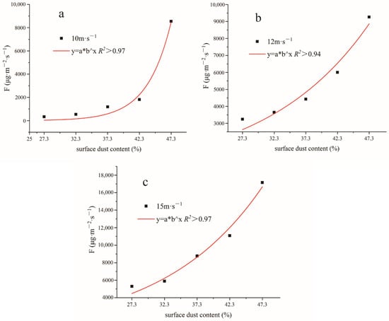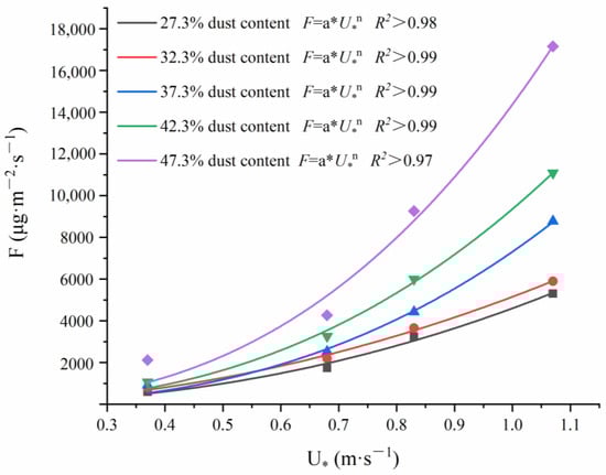 As shown in Figure 4, F increased at different rates for the same increase in under different dust content conditions. When was less than 0.68 m·s−1, F increased slowly with an increase in , whereas when was greater than 0.68 m·s−1, the increase rate of F with increased rapidly. For instance, as the Gobi dust content was 47.3%, F increased from 2121.45 to 4267.29 µg·m−2·s−1/(m·s−1) when increased from 0.37 to 0.68 m·s−1, while it increased from 9262.99 to 17,157.31 µg·m−2·s−1/(m·s−1) as increased from 0.83 to 1.07 m·s−1. With increases in wind speed, the energy of saltation particles and the impact energy on the surface both increased, causing the amount of dust released per unit time to increase. It was previously shown that sand bombardment at high wind velocities can degrade the surface crust and increase the availability of dust under the gravel surface [,,]. Therefore, the saltation sand particles can continuously update the surface in order for the vertical dust flux to remain high. As a result, wind force and the bombardment of saltation particles are important dynamic conditions that determine dust emission. In addition, saltation bombardment is more capable of triggering dust emission under higher wind speed conditions.