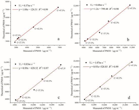 Correlation of measured and theoretical values of PM10 concentration under different wind velocities and surface dust contents. (a) = 0.37 m·s−1, (b) = 0.68 m·s−1, (c) = 0.83 m·s−1, (d) = 1.07 m·s−1.