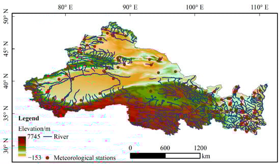 In this study, after eliminating the stations with more dissipated measurements and stations relocated and withdrawn, we selected the daily meteorological data of the maximum temperature, minimum temperature, average temperature, average wind speed, sunshine hours, relative humidity, precipitation, etc., extracted from 110 meteorological observation stations in five provinces of Northwest China from 1960 to 2020 and the data were obtained from China Meteorological Data Network (https://data.cma.cn) (accessed on 3 April 2021).