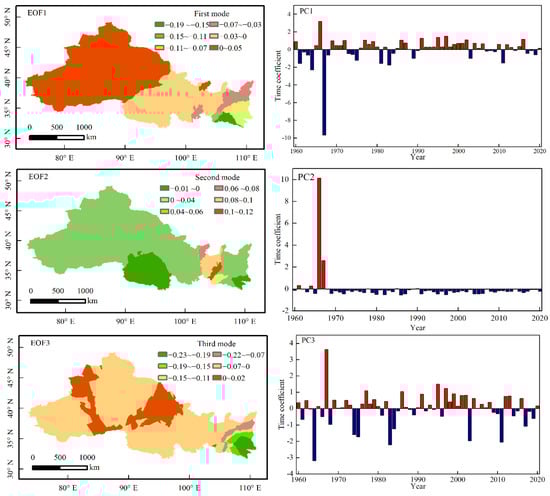 In this study, the empirical orthogonal function (EOF) combined with the North test are used to decompose the wetness index of 110 meteorological stations in five provinces of Northwest China from 1960 to 2020 [38], ArcGIS and Origin are deployed to plot the spatial distribution of the EOF decomposition and the corresponding temporal weight coefficients (Figure 2). The results show that variance contributions of the first three modes were 30.31%, 24.05%, and 12.69%, respectively and the cumulative contribution is 67.05% (Table 2), which passed the North significance test. Therefore, the first three modes can better reflect the spatial distribution characteristics of the wetness index in the northwest.