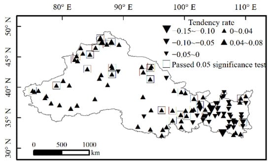 In the past 61 years, there has been a significant spatial distribution difference in the interannual distribution of the tendency rate of the wetness index change in five provinces of Northwest China (Figure 3), with the tendency rate gradually decreasing from west to east, i.e., the tendency rate in the western and central regions is mainly positive, accounting for 88.24%, and the wetness index is increasing, on the contrary, while in the eastern region the tendency rate is mainly negative, accounting for 11.76%, and the wetness index is decreasing, which is consistent with the spatial distribution of the wetness index obtained in the previous study. The areas with the largest positive tendency values are dominantly distributed in northern Xinjiang and the smallest negative tendency values are mainly located in southern Gansu, which is consistent with the findings of Shi et al. [32] that the significantly wetter areas are located in the Tianshan Mountains in northern Xinjiang, Northwest China, with a shift of being warm-dry to warm-wet, and the findings of Shen et al. [42] that southern Gansu and eastern Qinghai are significantly drier. In addition, the wetness index increased significantly more than it decreased, which is also consistent with the conclusion that more areas have become wetter than areas that have become drier in China in recent years [42].
