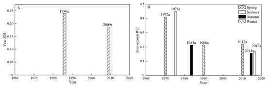 Using the regime shift detection test to test the interannual and seasonal wetness index in five provinces of Northwest China over the past 61 years, we can see that (Figure 4A,B) the wetness index had two pattern shifts, the pattern shifts occurred in 1986 and 2009, the corresponding pattern shift indexes were 0.24 and 0.19, respectively, with a more obvious sudden change in 1986. This is consistent with the findings of Shi et al. [32], who concluded that the northwest region changed from warm-dry to warm-wet in the late 1980s, and Ma et al. [43], who found that the northwest region became relatively wet after 1985. It is also consistent with the findings that precipitation in the northwest region began to increase in 1986 [44]. In terms of seasons, the spring wetness index underwent a total of two pattern shifts in 1972 and 2012, corresponding to the RSI of 0.41 and 0.22, so the mutation was more prominent in 1972. The summer mutation occurred in 1976 and 2017, corresponding to the RSI of 0.45 and 0.17, so the mutation was most in prominent 1976. The autumn mutation occurred in 1983 and 2014, with RSI of 0.21 and 0.16, so the mutation was more obviously in 1983; the winter wetness index only mutated once in 1988 with RSI of 0.21. Apparently, spring, summer, autumn, and winter have the most significant abrupt changes in the wetness index in 1972, 1976, 1983, and 1988, respectively, with the earliest shift in spring and the strongest response to climate warming, followed by that in summer and then that in autumn and winter.
