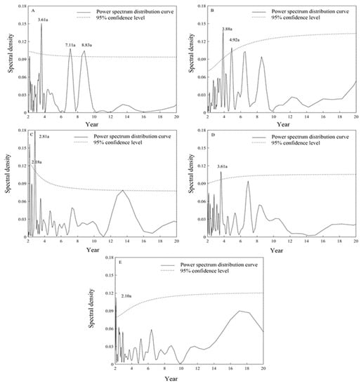 The results showed that the annual wetness index existed in cycles of 3.61 a, 7.11 a, and 8.83 a in the study area (Figure 5A). Among the seasons, the spring periods were 3.88 a and 4.92 a (Figure 5B), the summer periods were 2.18 a and 2.81 a (Figure 5C), the autumn and winter periods were 3.61 a and 2.10 a, respectively (Figure 5D,E), and all of them passed the 95% confidence level. Manifestly, the wetness index in the study area is characterized by a short period and consistent with the quasi-period of atmospheric circulation 2~4 a and El Niño 2~7 a.