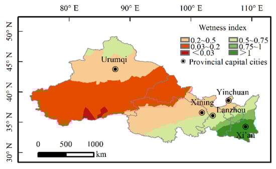 It was shown that the Kriging interpolation method takes into account the altitude of which effect and accuracy are optimal [45]. Therefore, in this study, we use the Kriging interpolation method to obtain the average dry-wet zones distribution map of five provinces of Northwest China from 1960 to 2020 (Figure 6). As Figure 6 already suggests, except for the extreme arid region, the rest of the climatic zones show a clear band-like distribution. The extreme arid region with a wetness index <0.03 is mainly distributed in the southern part of Xinjiang’s Qiemo County and Minfeng County. The arid region (0.03~0.2) is mainly distributed in southern Xinjiang, northwestern Gansu, and northern Qinghai. The semi-arid region (0.2~0.5) is mainly distributed in northern Ningxia, the Hexi Corridor, central Qinghai, and northern Xinjiang. The semi-humid region (0.5~0.75) is mainly distributed in southeastern Qinghai, southern Ningxia (0.5~0.75) mainly in southeastern Qinghai, southern Ningxia, northern Shaanxi, and northern Xinjiang. The relatively humid region (0.75~1) is mainly distributed in the Guanzhong Plain of Shaanxi and Tianshui, Pingliang, and Qingyang of Gansu. The humid region (>1) is mainly distributed in the Qinba Mountains of southern Shaanxi and Longnan City of Gansu.