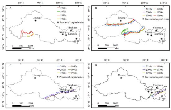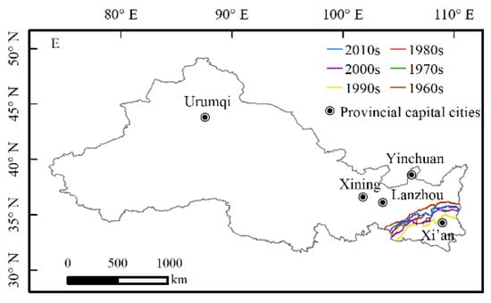 There are also two semi-arid and semi-humid boundaries (0.5 boundary width), one of which is located in the northern part of northern Xinjiang and the other of which in the southeastern part of the study area (Figure 7C). In the past 61 years, the boundary in the northern part of northern Xinjiang has shifted southward and in the southeastern part has shifted northwestward as a whole. The boundary in the northern part of northern Xinjiang was located near the Altay Mountains north of the Junggar Basin in the 1960s but disappeared in the 1970s, indicating that the western part of northwestern Xinjiang was in a drier stage in the 1970s and had not yet embarked on the stage of warming and humidification. The boundary shifted southward in the 1980s in comparison with 1960s, the area of semi-humid region expanded, indicating that northwestern Xinjiang began to be warm and wet. This is consistent with the fact that the precipitation in the high mountainous areas such as Tianshan and Altay Mountains increased significantly in the 1980s and 1990s [32]. The line continued to move southward in the 2000s and 2010s and the area of the semi-humid region in the northern part of Xinjiang continues to increase, indicating that the western part of Northwest China is still at present in the wetter stage. The other southeastern 0.5 boundary started from the southeast corner of Qinghai in the west in the 1960s, and passes through Xining and Lanzhou to the central part of Ningxia. The western section of the boundary shifted to the northwest in the 1970s, and the eastern section shifted to the southeast to the northernmost part of Shaanxi. The western section of the boundary shifted southward in the 1980s compared with that of 1970s, the western and middle sections shifted to the northwest in comparison with the 1960s, the eastern section shifted to the southeast. The line continued to shift to the southeast in the 1990s, it shifted to the northwest in the 2000s and 2010s, and showed a northward trend in the 2010s relative to the 1960s with the largest movement and the area of the southeastern part of the study area reached the largest semi-humid zone.
