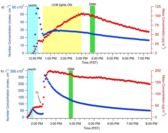 Summary Particle number concentration (blue trace, left Y-axis) and particle mass concentration (red trace, right Y-axis) for (a) TOL/OH SOA at low relative humidity and (b) LIM/O3 SOA at low relative humidity. The blue shaded area corresponds to the addition of nicotinic seed particles, the yellow shaded area corresponds to photooxidation, and the green shaded area corresponds to the injection of DMA.