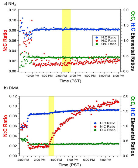 Figure 2 compares the reactive uptake of NH3 to that of DMA by LIM/O3 SOA particles under low RH. For this comparison, d-limonene SOA was used because it exhibited a more efficient reaction with NH3 in comparison to toluene SOA [48]. When exposed to the same mixing ratios of NH3 and DMA (200 ppb), d-limonene SOA had a higher reactivity with DMA as shown by the faster and larger increase in the N:C ratio in the particles. More specifically, when exposed to NH3, the N:C ratios of the d-limonene SOA particles increased by 0.004 after nearly 2 h (Figure 2a); while the increase in the N:C ratios was an order of magnitude greater (ΔN:C = 0.073) 2 h after DMA exposure (Figure 2b). This finding is novel and suggests that DMA uptake will result in a larger organic nitrogen fraction in the condensed phase compared to NH3 uptake by SOA. Therefore, the amount of organic nitrogen in the particulate matter could be underestimated based on atmospheric models that currently neglect this formation pathway.