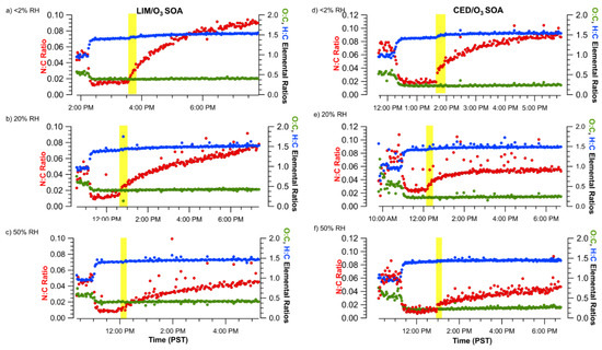 Elemental ratios of H:C (blue trace), O:C (green trace), and N:C (red trace) as a function of time for LIM/O3 SOA at (a) <2%, (b) 20%, and (c) 50% RH and CED/O3 SOA at (d) <2% to (e) 20% to (f) 50% RH. DMA exposure is highlighted by the yellow region.
