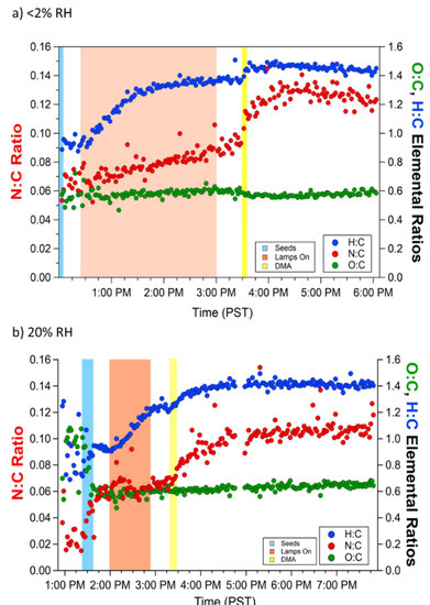 Figure 4 shows toluene photooxidation SOA exposed to DMA at low and 20% RH. The exposure of toluene SOA to DMA (yellow region) increased the N:C ratio of approximately 0.040 at both low (Figure 4a) and 20% RH (Figure 4b) after 2 h. In addition, there was an increase in the H:C ratio of 0.012, which is consistent with the replacement of C=O with C=NH, indicating that DMA uptake led to the formation of NOCs within the aerosol. Figure 4a shows an initial increase in the N:C ratio during the lamps on a period (red region) which was attributed to nicotinic acid seed particles coalescing with other particles during SOA formation, as seen in the number concentration data in Figure 1a. This effect was less pronounced at 20% RH because the particle yield was lower and therefore the coagulation with other particles was as not as prominent. As the N:C ratios were not corrected for particle coagulation, the increased error is expected for the N:C and DMA uptake coefficients reported for the toluene dataset. Within this range of RH (0–20%), Liu et al. (2018) reported no significant change in NH3 uptake by toluene SOA [51]. In that same publication, they reported an increase in NH3 uptake by toluene SOA with an increase in RH when the RH was between 20% and 60%, explaining that the limitations in mass transfer rate for uptake due to the high viscosity of toluene SOA at low RH disappear at RH > 20% [51]. Unfortunately, our toluene SOA measurements at 50% RH were not reliable due to the strong suppression of SOA yield at elevated RH, and therefore the conclusions made by Liu et al. (2018) could not be verified in this work. Additional experiments using a higher particle concentration for increased humidity are needed to identify the impact RH has on DMA uptake by toluene SOA.