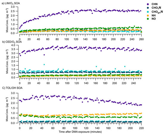 Mass concentration of nitrogen-containing families extracted from AMS data plotted versus time after DMA exposure for (a) LIM/O3 SOA, (b) CED/O3 SOA, (c) TOL/OH SOA under low RH.
