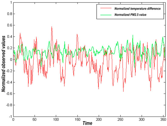 Usually, there is no direct physical correlation between PM2.5 and air temperature. The correlation between air temperature and haze weather affects the migration and diffusion of PM2.5 by affecting atmospheric stability. The exchange intensity between upper air and lower air increases with the increase of atmospheric temperature. The concentration of PM2.5 also decreases with the increase of its diffusion in the vertical direction of the atmosphere. Conversely, the concentration of PM2.5 increases as its diffusion decreases. The correlation between temperature difference and PM2.5 difference is shown in Figure 1.
