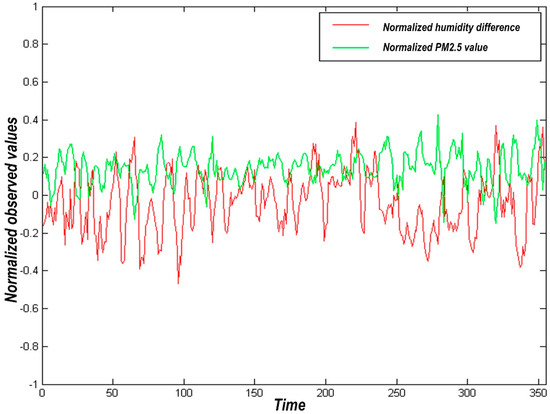 In Figure 3, the correlation analysis of the difference between the humidity and PM2.5 data collected by the two stations in the study area shows the correlation coefficient R = 0.3128, showing a positive correlation between the two. The difference in humidity showed that it increased to the peak and immediately began to decline within the whole year. The concentration of particulate matter fluctuated within the range of higher values throughout the year. In the early summer, the difference of PM2.5 gradually decreases and then starts to rise again after the end of summer. Since then, humidity difference data and particulate concentration values show a trend of up and down oscillation.