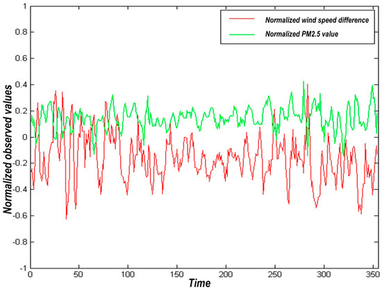 Correlation analysis of the difference between wind speed and PM2.5 data collected by two stations in the study area (data collected by urban stations minus data collected by Xianghe station) shows a strong positive correlation between the two, with the correlation coefficient R = 0.3456. As shown in Figure 4, the wind speed difference fluctuates back and forth throughout the year. Meanwhile, the difference of PM2.5 concentration increases with the increase of wind speed. In other words, when the urban wind speed is high, the concentration of PM2.5 is relatively low. Conversely, the concentration of PM2.5 is relatively high when the urban wind speed is low.