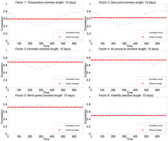 After analysis, we found that the influence of various parameters on the concentrations of PM2.5 in different seasons is not consistent, so in this section, we use “time window value” grey correlation analysis: specify the first gray analysis sample size K as “time window”, starting from the first observation, with K as the sample size calculation correlation K1, again from the second set of observations, in turn, calculating correlation K2, and then through the analysis of (K1 Smoothing and mean processing of correlation degree sequence of Kn). Finally, the average value of the daily data of the two stations is taken as the meteorological parameter. Then, the correlation analysis between each meteorological parameter and PM2.5 is carried out based on the grey correlation of the time window, as shown in Figure 5.