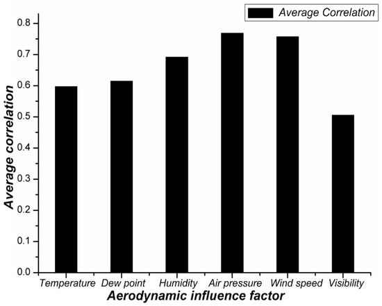 Different ground meteorological impact factors have different aerodynamic principles on PM2.5, which results in their varying degrees of influence on PM2.5. This section uses the grey correlation method to analyze the joint influence of humidity, air pressure, wind speed, dew point, temperature, and visibility on PM2.5 concentrations. The system’s characteristic sequence and influencing factor sequence are, respectively, hourly concentration of PM2.5 and the observed values of humidity, air pressure, wind speed, dew point, temperature, and visibility in the same period. After considering the dimensionality of the significant difference between the data, Formula (15) was used to conduct range normalization processing of the data before analysis.