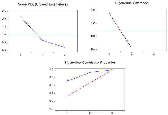 The scree plot shows the ordered eigenvalue, which shows that only a single FINDEX factor is above the red dotted line. In contrast, the remaining two factors fall below the red dotted line with an eigenvalue less than unity. The second and third plots in the same figure show the eigenvalue differences and cumulative proportion of eigenvalue for the ready reference. The orthonormal loadings clearly show that the first component has a more significant percentage variance in the PCA, i.e., 71.6%, while component 2 exhibits only 21.6%. The remaining is a 6.5% percentage variation attributed to the third component not shown in the orthonormal loadings. Similarly, Figure 2 shows the eigenvalue plots and eigenvalue loadings for the construction of INOVINDEX. The scree plot shows that only a single component is above the dotted unity line, while the rest are less than unity and fall below the red dotted line. Subsequently, eigenvalue differences and their cumulative proportions are also reported in the same figure for ready reference. The orthonormal loadings in the same figure illustrate that component-1 has a more significant percentage variance, i.e., 74.1%, while component-2 has 14.8%. The remaining percentage variance in making INOVINDEX is attributed to the four other components that occupied a low variance.