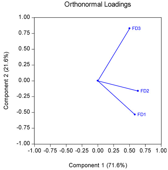 Table 3 shows the construction of the relative weighted index for FD and innovations by the PCA matrix. The statistics show that in the FD index (FINDEX) construction, the first Principal Component (PC) value has an eigenvalue more than unity, i.e., 2.148, while the remaining two PC values are 0.647 and 0.203, respectively. Further, each FD factor has three vector loadings represented by PC1, PC2, and PC3. PC1 is considered the higher additive value that is used for making FINDEX.