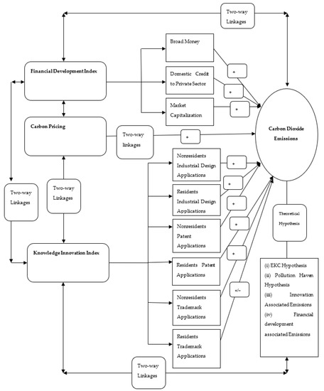 Figure 3 shows that FD and knowledge innovations both have a differential impact on carbon emissions. Financial development is directed to reduce carbon emissions by adopting green financial instruments to support industrial production, ultimately supporting the country’s ESA of low carbon emissions; however, FD supports EG on the cost of carbon emissions. Thus, it would affect the sustainability agenda across countries. Similarly, knowledge innovations would positively or negatively impact carbon emissions via the two main mechanisms, i.e., first, knowledge innovations would help diffuse knowledge about environmental sustainability among the masses that help limit carbon emissions. In contrast, the second possible mechanism ignores environmental regulations to achieve economic gains; thus, it would increase carbon emissions. It is assumed that both the positive and negative outcomes are likely to get under the innovation–finance–carbon nexus across countries. The growth-specific factors, i.e., EG, energy demand, and trade openness, are expected to positively correlate with carbon emissions as continued EG, NRE, and trade liberalization policies would negatively impact environmental quality; thus, damaging ESA. Finally, carbon pricing would likely achieve desirable positive policy-oriented outcomes to limit carbon emissions across countries. The two-way linkages between the stated factors would be expected in the causal mechanism. Based on the research framework of the study, the study proposed three more research hypotheses for empirical analysis, i.e.,