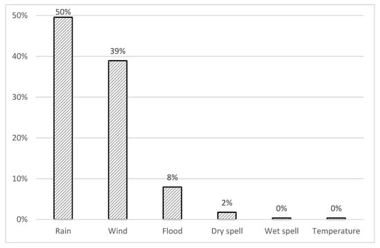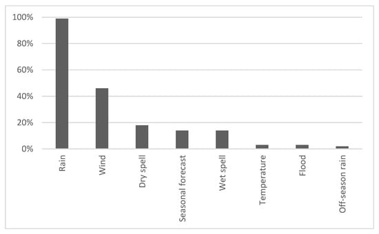 The most important WCIS that farmers need to guide their day-to-day decision-making are shown in Figure 4. In general, all respondents stated that the rain forecast is the most important weather information for them. The wind forecast comes in the second position in the order of importance (46%) followed by the dry-spell forecast (18%). The seasonal and wet-spell forecasts come together in the fourth position with 14% each. The temperature, flood and off-season forecasts are the least important WCIS according to farmers.