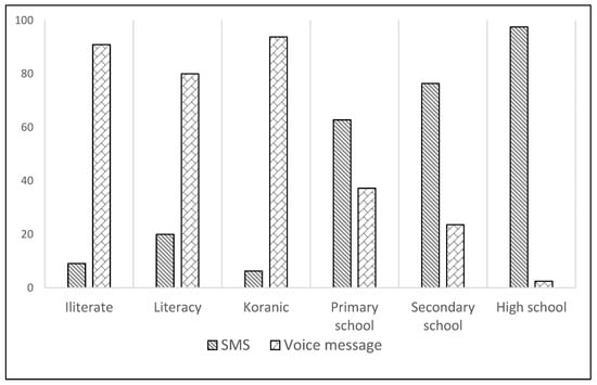 The level of uptake of WCIS is intrinsically associated with some socio-economic characteristics among which the most important are, age and education, being a member of a farmers’ organization and being capacitated to use WCIS, owning a radio. Young and educated farmers have a high propensity to adopt innovation when it comes to WCIS, which requires a minimal use of a basic cell phone and the ability to read text messages. Alternatively, older people are reluctant to change and entrust their ancestral beliefs []. Further, low literacy levels remain a challenge in some rural contexts in Senegal and limits the utility and impact of mobile-based agricultural information and services for some segments of the population, particularly female household heads and the elderly [,].