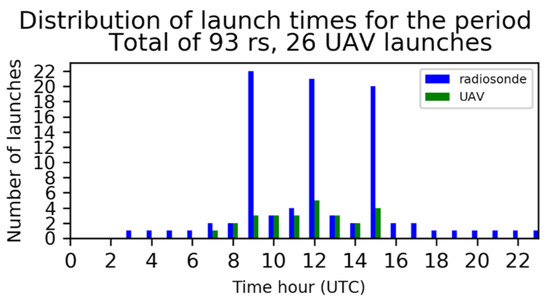 Distribution of radiosonde (blue) and UAV (green) launch times during the inter-comparison period.