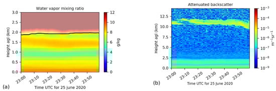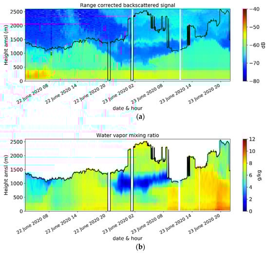 Example of one-hour time series of (a) water vapour mixing ratio (the black line indicates the maximum height for trusted water vapour measurement) and (b) attenuated backscatter. Note that BB-DIAL backscatter was not calibrated in this study, so the unit is arbitrary.