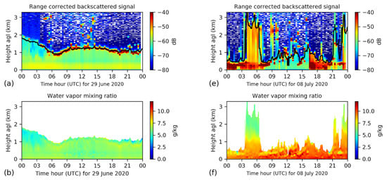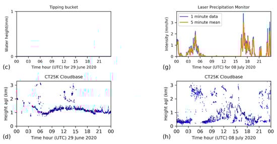 Figure 4 shows BB-DIAL data from an example dry day (29 June) and wet day (8 July). In general, the maximum height for the water vapour measurement is limited by thick cloud (see Figure 4a,e), with its impact on water vapour measurement height seen in Figure 4b,f). In clear sky, the maximum height for water vapour measurement varies between 1000 and 2000 m. For the wet day several episodes of rain occurred, with a laser rain recorder showing precipitation at ground level (Figure 4g). Comparison of Figure 4f with the timing of rain shown in Figure 4g shows that the instrument is able to measure in rain. For the event between 03:00 and 06:00 the laser cloud recorder shows a cloud base between 3000 m and 2500 m (Figure 4h), during which time there were BB-DIAL water vapour measurements up to that range. This is particularly interesting because a large variation in the water vapour mixing ratio with height is clearly captured (Figure 4f). This can be due to a change in temperature and air masses, but also due to non-adiabatic processes because of the rain.