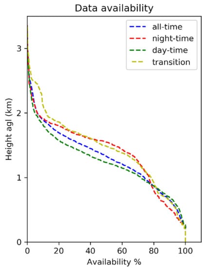 During this experiment, data were missing for occasional short periods due to slow internet connection on the site. The data availability was computed using all data files which were not missing in the first gate. Figure 5 shows the maximum height considering all times of day, night-time only, daytime only and a transition period (defined as ±1 h around sunset and sunrise). Considering all times of day, data availability at 1000 m was 75%, falling to 35% at 1500 m. A 400 m increase in average data availability height was seen from day to night, with this increase occurring between 1000 m and 1800 m above the ground. For example, at 1500 m, availability at night was close to 55% but only 25% during the day-time. The overall average data availability height is 1300 m for the assessment period. These results are consistent with those published by Newsom et al. [16] and Mariani et al. [20].