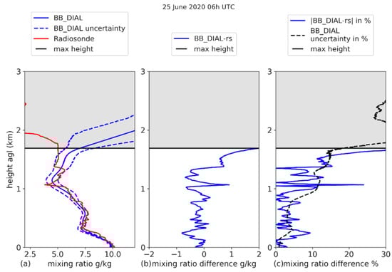 (a) Example of BB-DIAL (blue) and radiosonde mixing ratio for the 25 June 2020 at 06 UTC, (b) is the difference between the BB-DIAL mixing ratio and the radiosonde mixing ratio, (c) in blue is the absolute difference (%) against radiosonde measurement, black dash-line is the BB-DIAL uncertainty in % against the BB-DIAL measurement. The horizontal black line is the maximum height trusted value.