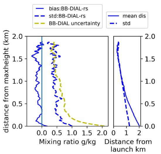 Because it was noticed that the discrepancy with the radiosonde increases towards the maximum height, the statistics have been recalculated versus the distance below maximum height. Figure 8 shows that the standard deviation increases to over 0.5 g/kg within 200 m below the maximum height. It also shows that the BB-DIAL uncertainty, while larger than the standard deviation, has a very similar profile shape. A possible mislocation in space between the radiosonde and the beam of the BB-DIAL might explain part of the increase in error. At the maximum height, the radiosonde is on average 2 km away from the BB-DIAL (Figure 8 right). On Figure 7a left, dash blue curve, there is no increase in the standard deviation above 1250 m when the radiosondes are, on average, more than 2 km away from the BB-DIAL (Figure 7b right, solid blue curve), so the effect of miss-location at the maximum height does not explain the increase in error. The increase in the offset in time only reaches 6 min at 2 km. This value remains negligible compared to the 20 min average of the BB-DIAL measurement. The BB-DIAL uncertainty follows the shape of the measured standard deviation and also increases when close to the maximum height. This confirms that there is a slight decrease in the BB-DIAL performance when close to the maximum height.