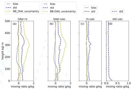 Figure 10 shows the inter-comparison of the three instruments for all the UAV flights completed. The bias of the BB-DIAL against the radiosondes and the UAV are very similar. There is an increase in the standard deviation of the UAV measurement in the first 20 m (Figure 10d), suggesting these measurements are slightly more variable than the rest of the profile, which shows a very small random noise. Above 50 m, the BB-DIAL bias shows the same oscillation mentioned in the comparisons with the radiosondes for the full data set. BB-DIAL data below ~50 m should not be considered because they are the surface measurement. None of the measurements are perfect, while very close, UAV and radiosondes data show some differences which can be due to sensor and representativeness errors and also time collocation (there can be up to 15 min difference between the radiosonde launch time and the mid-point of the UAV flight). While there is an increase in the standard deviation between UAV and radiosondes at 300 m (Figure 10c), this does not fully explain the increased variability seen at 340 m for the BB-DIAL between both UAV and the radiosonde.