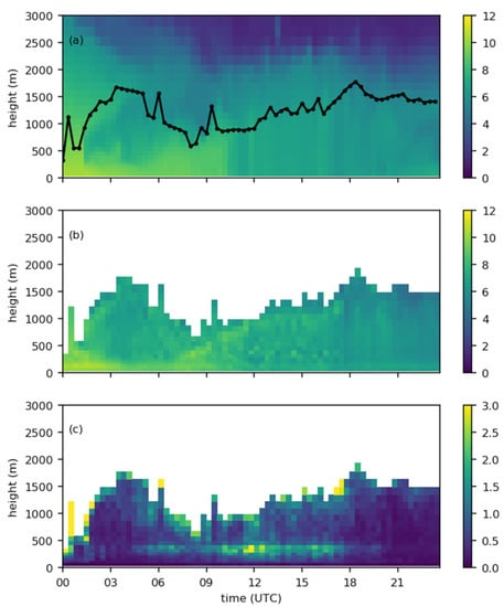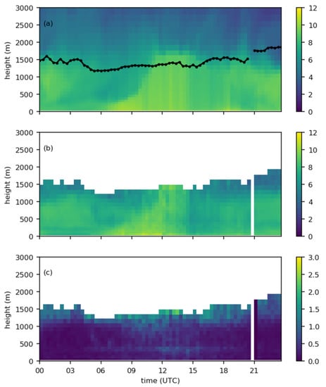 Example mixing ratio time-series for 14 July 2020: (a) UKV model background; (b) BB-DIAL estimation thinned at UKV temporal and vertical resolution; (c) BB-DIAL uncertainty, all values are g/kg.