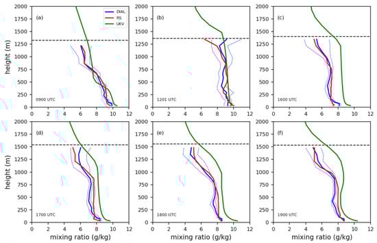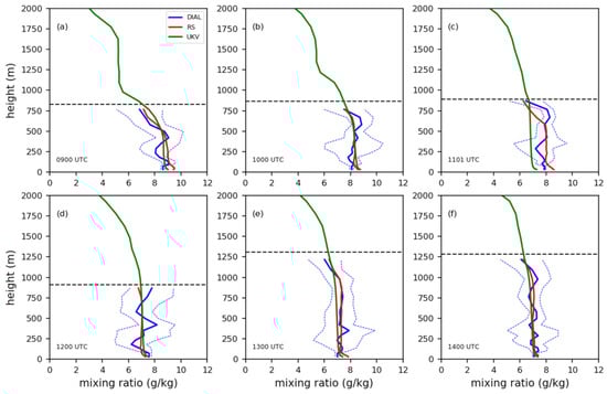 Water vapour mixing ratio profiles for different times on 24 June 2020: (a) 09:00 UTC, (b) 12:00 UTC, (c) 16:00 UTC, (d) 17:00 UTC, (e) 18:00 UTC, (f) 19:00 UTC. The horizontal dashed line represents the maximum height from the Vaisala algorithm.