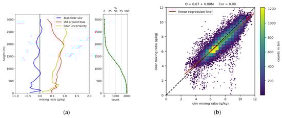 Comparison of BB-DIAL with the UKV model for the full assessment period. (a) Vertical profile of bias, standard deviation, BB-DIAL uncertainty and BB-DIAL data availability. (b) Scatterplot of BB-DIAL versus UKV, superimposed with a 2D histogram of the number of counts.