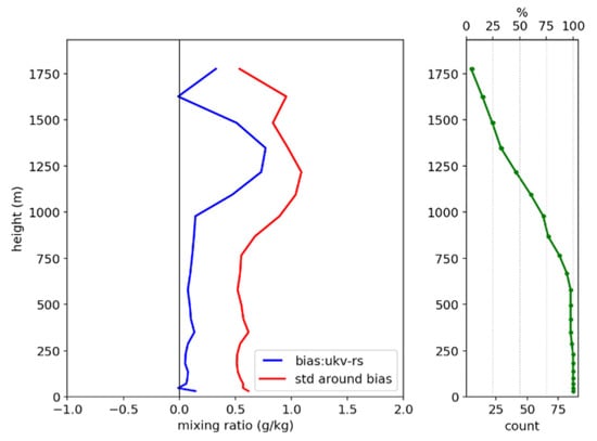 Over the whole assessment period, the bias between the BB-DIAL and the radiosonde remains small (Figure 7a). It is near 0 between 750 m and 1300 m, slightly negative below 750 m becoming quite variable below 500 m with two negative maxima of ~−0.32 g/kg at 200 m and 400 m. The bias becomes positive above 1700 m, but the significance of the result at this altitude is questionable as there were only 13 inter-comparisons with radiosondes at this height. The relatively strong variation of the bias in the first 100 m (from −0.27 to +0.20 g/kg) is mainly due to the BB-DIAL data in the lowest 50 m being the surface measurement (Figure 7c). Then just above 50 m, the bias becomes positive up to 100 m and then decreases and becomes negative with a maximum negative value at 200 m. The standard deviation remains small (less than 0.5 g/kg) except around 300 m, 1350 m and above 1800 m. At ~300 m, the standard deviation peak is 0.75 g/kg. Between 300 m and 400 m, which corresponds to the near and far field overlap region, the negative bias slightly increases with height.