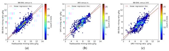 Scatter plots (in the form of 2D histograms). Note that the radiosonde data have been averaged at the BB-DIAL resolution (as provided by Newsom et al. 2020) at each model level and value below 50 m have been excluded. (a) BB-DIAL versus radiosonde. (b) UKV versus radiosonde. (c) BB-DIAL versus UKV.