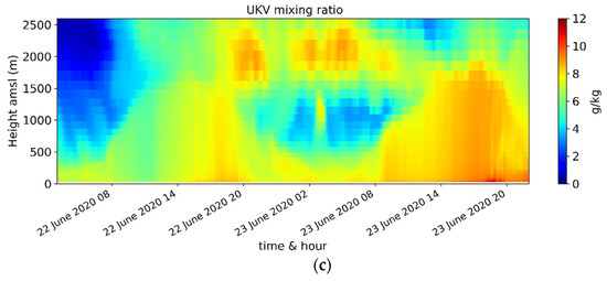 The UKV is the Met Office’s high-resolution non-hydrostatic convection-resolving numerical weather predication (NWP) model [21]. It has a 1.5 km horizontal grid-spacing and 70 vertical levels, with a vertical resolution of 20 m close to the ground, increasing to 200 m at 3 km altitude. Operationally it is run at one-hour intervals. The UKV employs 4D-Var data assimilation [22] over a one-hour time window, with a 10 min time step within this time window. In the example shown in Figure 11 the UKV and BB-DIAL agree quite well, but with the UKV mixing ratio being slightly larger compared to the BB-DIAL. On the day illustrated (24 June 2020), several radiosondes were launched (Figure 12) which confirm that the UKV mixing ratio is an over estimation, particularly after 16:00. The BB-DIAL is in closer agreement with the radiosonde than with the UKV.