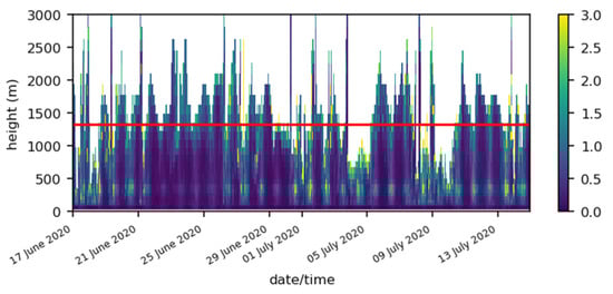 As already mentioned, the lowest 50 m are not measured by the BB-DIAL but by the surface sensor. Vaisala proposes only giving the surface measurement and then the first BB-DIAL measurement at 50 m for the production model. Then just above, the bias is close to zero but increases quite sharply up to around 100 m and then decrease to become negative with a maximum at around 350 m, where both the bias and the standard deviation are maximum. Such features are seen in all the inter-comparisons (radiosonde, UKV and UAV) and was also seen by Mariani et al. [17], it corresponds to the region of overlap between the near range and far range telescope. This confirms the BB-DIAL origin. Such error is relatively well estimated by the error reported by the instrument. The height time cross section over the full period of the BB-DIAL uncertainty (Figure 19) shows an increase around midday. Solar contamination increases the noise. Vaisala is working on optimising the blending of the data from the near and far field.