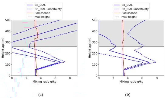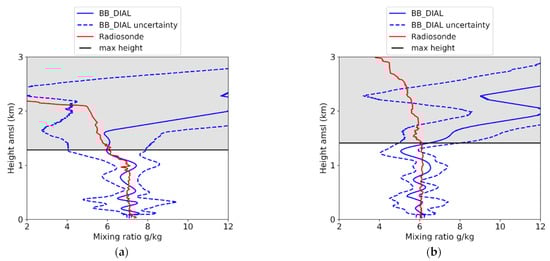 Examples of unrealistic oscillations in the BB-DIAL estimated mixing ratio profile with coinciding radiosonde measurements. The horizontal line indicates the BB-DIAL maximum height. (a) 14 July 2020 14:00 UTC, (b) 15 June 2020 12:00 UTC4.3. Dry Layer Above Fog.
