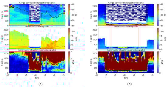 (a) BB-DIAL data for 16 June 2020. Top: range corrected backscatter (log scale). Middle: mixing ratio (g/kg). Bottom: reported BB-DIAL uncertainty (g/kg) for Cardington, (b) same as (a) but for the 4 February 2019 at Lindenberg from a similar BB-DIAL, the vertical red lines represent the radiosonde launch times, (Data provided by Dr Knist Christine DWD/Lindenberg).