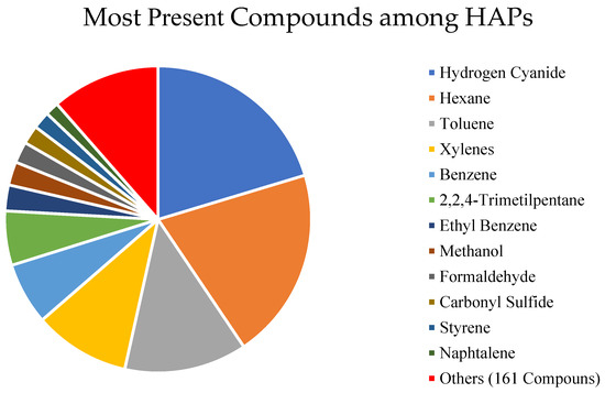 - Organic HAPs: according to the definition of VOC [42], all inorganic substances are excluded from the calculation of the total emissions. In this way, the emissions considered are representative exclusively of the organic HAPs released in the atmosphere as volatile compounds. In this specific case, the inorganic substances excluded from the database are mainly metals and acids (antimony, arsenic, beryllium, cadmium, chlorine, chromium, cobalt, mercury, hydrochloric acid, hydrofluoric acid, hydrogen cyanide, hydrogen sulphide, lead, manganese, nickel, phosphorus, and selenium).
