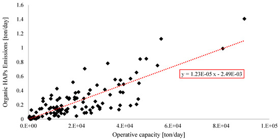 The definition of this EF was carried out by choosing the operational capacity of a plant as the activity index for the estimation of the emission factor, which is related to the total amount of HAPs emitted in one year of exercise. A linear trend can be obtained with good approximation when comparing different plants’ emissions as a function of their operational capacity.