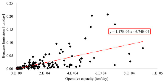 As stated previously and according to the EPA procedure for the definition of EF [41], the numerical elaborations were proposed by comparing the ratio of the two quantities examined: the HAPs annual emissions over the operational capacity of the plants (considered as the activity index). The data were represented in graphical form, and the trend line was traced to evaluate the existence of a correlation between these two quantities. The illustrated data are measured starting from the emissions by converting the original data from metric tons (i.e., 1000 kg = 2204 lb) per year [ton/y] to tons per day [ton/d], and from the operational capacity, reported in the database in barrels (i.e., 159 liters) of crude oil a day [bbl/d] and appropriately converted to [ton/d] as well. The EFs are then presented in [g/ton], and their values are estimated as shown in Section 3.2.