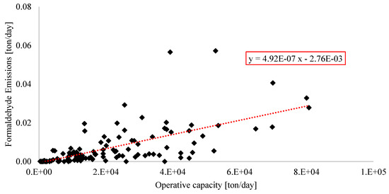 The formaldehyde emission trend is reported in Figure 4. The r value resulting from the analysis of the formaldehyde emission trend with the plant size is equal to 0.65, marking also in this case a “strong” positive linear correlation between the increase of formaldehyde emissions and the size of the plant. Moreover, in this case, by considering only one of the most representative compounds out of the total 187 compounds, it is possible to highlight a linear correlation like the one observed for all the HAPs.