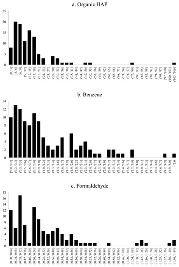Distribution of the dataset for (a) organic HAPs; (b) benzene; (c) formaldehyde.