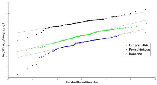 If the expected value for the log-normal distribution is considered as the global EF for the organic HAPs emitted from the refinery plants, it is possible to compare it with the emission values reported in the scientific literature. For instance, in the European BREF Reference Document for the Refining of Mineral Oil European Reference Document [2], it is possible to find a range for the emission of VOCs from refineries that goes from 50 to 1000 tons emitted for 1 million tons of crude oil processed from the plant, which corresponds to an emission factor of 50–1000 [g/ton] and is thus much higher than the emission factor for organic HAPs determined in this paper.