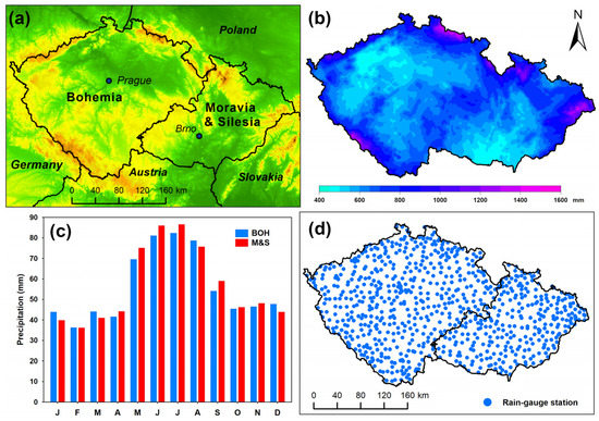 (a) Physical–geographical map of the Czech Republic with its division into Bohemia and Moravia and Silesia; (b) mean annual precipitation totals within the territory of the Czech Republic during the 1961–2020 period; (c) annual variations in mean monthly precipitation totals in Bohemia (BOH) and Moravia and Silesia (M&S) during the 1961–2020 period; (d) spatial distribution of used rain-gauge stations of the Czech Hydrometeorological Institute.