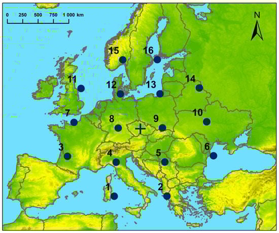 Position of the 16 SLP points as inputs for the calculation of circulation indices (the geographic center of the Czech Republic is indicated by a cross).