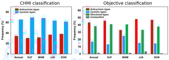 Relative annual and seasonal (DJF: December–February; MAM: March–May; JJA: June–August; and SON: September–November) occurrence frequencies (%) of the groups of circulation types under the CHMI (cyclonic and anticyclonic) and objective (anticyclonic, cyclonic, directional, and type U) classifications in the Czech Republic during the 1961–2020 period.